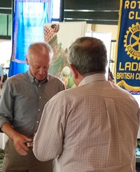 Past President of the Rotary Club of Kelowna Gord Savage (left) is thanked for this presentation by Peter Podovinikoff